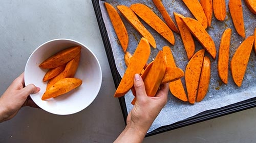 Den Backofen auf 200 °C vorheizen. Die Süsskartoffeln schälen, in ca. 1 cm dicke Spalten schneiden und in einer Schüssel mit dem Öl, dem Paprikapulver und dem Salz vermengen. Ein Blech mit Backpapier belegen und die Süsskartoffeln darauf verteilen. Im vorgeheizten Ofen in der Ofenmitte ca. 35 Minuten goldbraun backen.