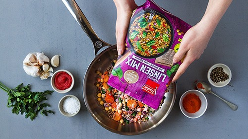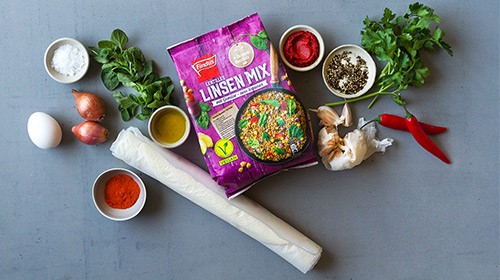Den Backofen auf 200 °C vorheizen. Das Olivenöl in einer grossen Bratpfanne erhitzen. FINDUS Linsen Mix, Tomatenpüree sowie Paprika in die Pfanne geben, mit Wasser ablöschen und ca. 4 Minuten unter gelegentlichem Rühren einkochen. Mit Salz und Pfeffer würzen und die Füllung abkühlen lassen.