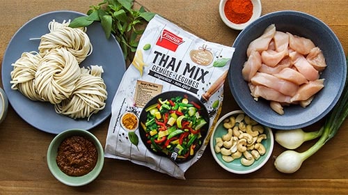 - Poulet und FINDUS Thai Mix anbraten und mit Kokosmilch und Bouillon aufgiessen.