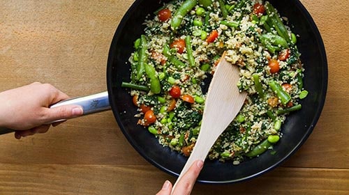 Den gefrorenen FINDUS Quinoa Mix ohne Öl in einer beschichteten Pfanne für 5 Minuten unter Rühren anbraten. Herausnehmen und die Menge auf 4 Bowls (Schüsseln) verteilen.