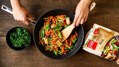 Etwas Öl in einer Bratpfanne erhitzen und den FINDUS Gemüsemix Asia einige Minuten rührbraten. In einer zweiten Pfanne den Blattspinat in wenig Öl kurz andünsten. Gemüsemix und Blattspinat in separaten Schüsseln zur Seite stellen.