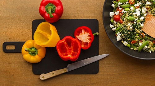 Fetakäse in Würfel schneiden, Petersilie klein hacken. Beides zur Quinoa-Mischung in die Pfanne geben und einmal kurz unterrühren. Peperoni waschen, den Deckel abschneiden, aushöhlen und die Kerne im Inneren entfernen.