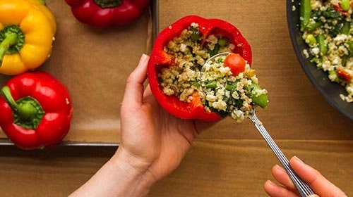 Quinoa-Mischung in die ausgehöhlten Peperoni füllen und anschliessend den Deckel wieder aufsetzen. Die gefüllten Peperoni in die ofenfeste Form setzen und für 15 Minuten bei 200 ºC Umluft im Ofen backen.