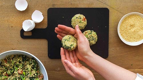Petersilie, Eier, gemahlene Mandeln und Mehl zum Quinoa Mix geben und gut vermengen. Die Masse mit den Händen zu ca. 10 bis 12 kleinen Bratlingen formen und diese im Paniermehl wenden.