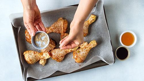 - Das Poulet marinieren und im Ofen backen.