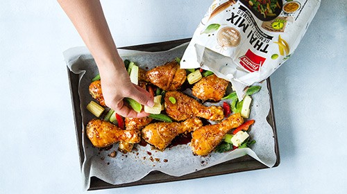 Das Fleisch aus dem Ofen nehmen, den Thai Mix zwischen den Pouletstücken auf dem Blech verteilen und beides zusammen für weitere 10 Minuten im Ofen rösten, bis alles durchgegart ist.