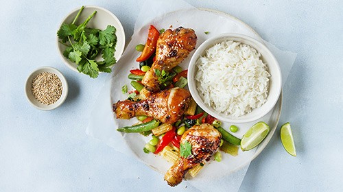 Manchmal muss es einfach schnell gehen, trotzdem soll die Mahlzeit Freude bereiten: Mit wenigen Handgriffen sind Reis, Poulet und Gemüse innerhalb von 30 Minuten fixfertig und bereit zum Geniessen. Das perfekte Menü also für laue Sommerabende, an denen wir lieber mehr Zeit draussen als in der Küche verbringen.