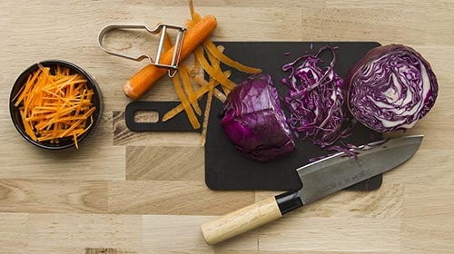 Für die Erdnusssauce alle Zutaten in eine Schüssel geben und miteinander vermengen. Die Karotte und den Rotkohl in feine Streifen schneiden oder raspeln.