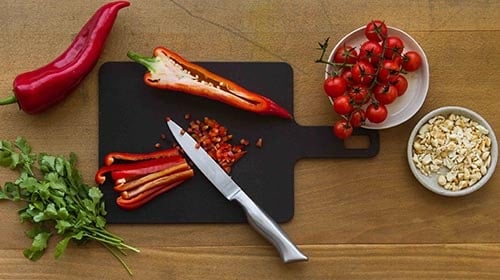 Die Cashewkerne in einer Bratpfanne ohne Fettzugabe goldbraun rösten und anschliessend zerstossen. Die Paprikaschote in Ringe schneiden, den Koriander grob hacken und die Cherrytomaten halbieren.