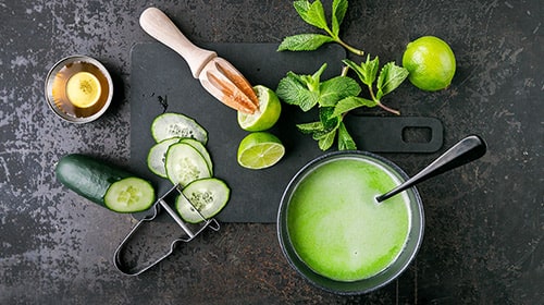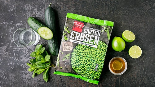 Den Limettensaft und den Agavensirup mit der Flüssigkeit der FINDUS Erbsen verrühren. Die Minze in feine Streifen schneiden und zugeben. Die Gurke mit dem Sparschäler oder einer Mandoline der Länge nach in dünne Scheiben schneiden.