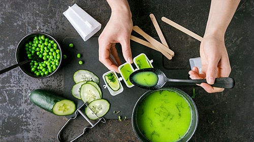 In jede Glaceform 1-2 Gurkenstreifen geben, und die zur Seite gestellten Erbsen auf die Formen verteilen. Mit der Flüssigkeit auffüllen und ca. 1 Stunde gefrieren.
