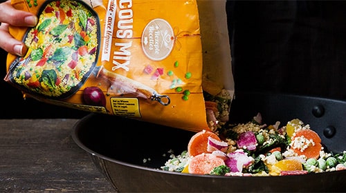 Den Backofen auf 200 °C Ober- und Unterhitze vorheizen. Den tiefgekühlten FINDUS Couscous Mix in eine Pfanne geben und bei mittlerer Hitze unter gelegentlichem Rühren ca. 5 Minuten erwärmen. Anschliessend in eine Schüssel geben.