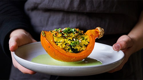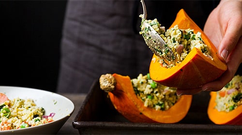 Kürbisse gehören in der kalten Jahreszeit einfach dazu, stecken sie doch voller wertvoller Inhaltsstoffe. Ausserdem lassen sie sich ganz einfach zubereiten. Kombiniert mit Couscous und einer grünen Sauce wird aus dem gesunden Herbst- und Wintergemüse ein kontrastreiches Gericht, das gute Laune macht und viel Energie verleiht. Für eine vegane Variante einfach Sojaprodukte verwenden – so schmeckt es allen am Tisch.