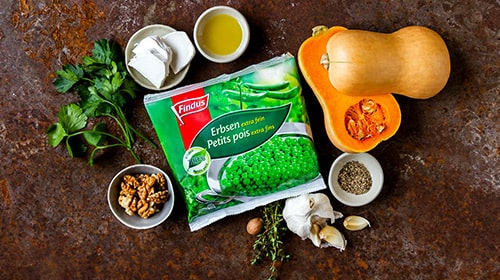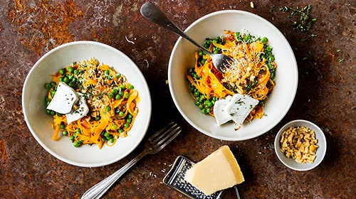Herbstzeit ist Kürbiszeit. Suppe, Gnocchi, im Ofen gebacken – alles unglaublich gut. Aber wenn es mal was Neues sein darf, schlagen wir vor, den orangen Liebling durch den Spiralizer zu drehen und fix zu Pasta zu verarbeiten (funktioniert übrigens auch bestens mit einem Julienne-Schäler). Das ist supergesund und sorgt für den Wow-Effekt auf dem Teller. Erst recht in Kombination mit der exquisiten Nussbutter, den Erbsen für den Farbkontrast und dem Ziegenkäse für das gewisse Etwas. En Guete!