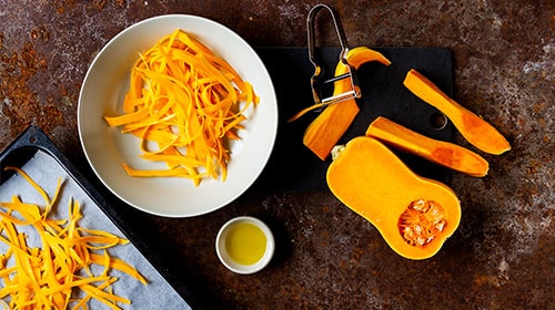 Den Backofen auf 220 °C vorheizen. Den Kürbis schälen und mit einem Spiralizer oder dem Julienne-Sparschäler in feine Streifen hobeln, diese mit dem Olivenöl vermengen und auf ein mit Backpapier belegtes Blech geben. Im vorgeheizten Ofen ca. vier bis fünf Minuten bissfest rösten.