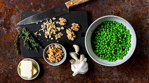 Die Erbsen im Salzwasser drei bis vier Minuten kochen, dann das Wasser abgiessen und die Erbsen zur Seite stellen. Den Knoblauch und die Baumnüsse fein hacken, die Butter in einer Bratpfanne ca. drei Minuten erhitzen, bis sie hellbraun wird und schäumt. Den Knoblauch, die Nüsse und den Thymian zugeben und mit der braunen Butter verrühren.