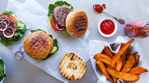 Verwandle deinen Essbereich für einen Abend in ein cooles amerikanisches Diner mit unserem Burgerrezept. Aber ... «with a twist», wie man in den USA so schön sagen würde. Zum Burger kombinieren wir dieses Mal nicht die gewohnten Pommes Frites, sondern eine leckere Alternative, die Süsskartoffel. Die süssen Knollen stammen ursprünglich auch aus Mittel- und Südamerika. Wusstest du jedoch, dass Sweet Potatoes gar keine Erdäpfel sind? Die klassischen Kartoffeln sind Nachtschattengewächse, während die Batate zur Familie der Windengewächse gehört. Beide landen unterdessen als beliebte Beilage auf den Tellern in der ganzen Welt.
