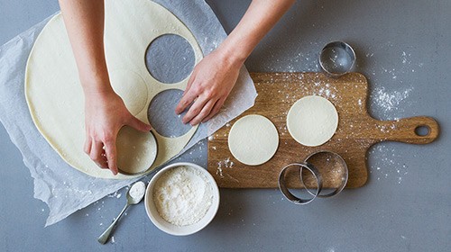 Den Teig auf der leicht bemehlten Arbeitsfläche ausrollen und mit einem runden Ausstecher Kreise à ca. 12 cm Durchmesser ausstechen. Die Teigrondellen zwischen Backpapierstücke legen und bis zur Verwendung im Kühlschrank aufbewahren.