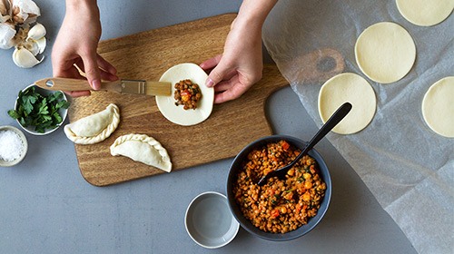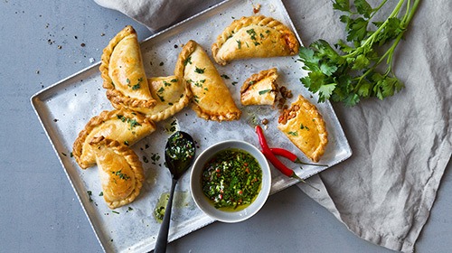 Die einfachen Mahlzeiten sind oftmals auch die besten: Die mittelamerikanischen Teigtaschen mit Linsenfüllung und pikantem Chimichurri sind ebenso effektvoll wie schnell zubereitet. Aufgrund ihrer Taschenform sind sie optimal zum Mitnehmen oder perfekt geeignet zum Geniessen auf dem Sofa, während man die neuesten Folgen der Lieblingsserie ansieht.