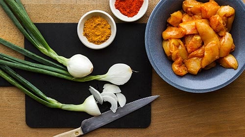 Das Pouletgeschnetzelte in einer Schüssel mit 1 EL Olivenöl, Currypulver und Paprika marinieren. Die Schalotte und die Knoblauchzehe in Streifen schneiden.