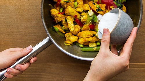 - Poulet und FINDUS Thai Mix anbraten und mit Kokosmilch und Bouillon aufgiessen.