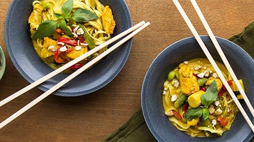 Die Asia-Nudeln beigeben und ohne Deckel ca. 5 bis 10 Minuten mitköcheln lassen, bis sie gar sind. Sollte die Sauce zu dick sein, noch etwas Kokosmilch oder Bouillon hinzugeben. Die Nudeln samt Sauce auf vier Tellern anrichten. Mit gerösteten Cashewkernen garnieren und servieren. Guten Appetit!