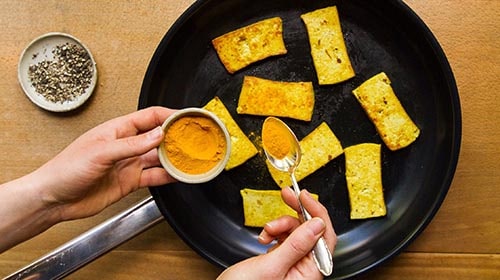Tofu in Scheiben schneiden. 1 EL Olivenöl in der Pfanne erhitzen und den Tofu ca. 5 Minuten anbraten. Mit Salz, Pfeffer und Kurkuma würzen. Aus der Pfanne nehmen und auf das Gemüse geben.