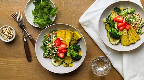 Das aus Südamerika stammende Quinoa gilt als besonders wertvoll, da es essenzielle Aminosäuren und Vitamine in hoher Konzentration sowie ein grosses Spektrum an Mineralstoffen enthält. Mit Erdbeeren und Pinienkernen garniert, verleiht man dem glutenfreien Urgetreide den besonderen Pfiff. Die Kinder werden es lieben, die vielen Zutaten in einer Bowl einzeln zu probieren. Ausserdem ergeben Gemüse, Tofu und Erdbeeren eine protein-, vitamin- und mineralstoffreiche vegane Mahlzeit.