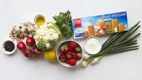 Bei diesem Rezept steigen Kindheitserinnerungen auf. Wann hast du das erste Mal FINDUS Fisch-Sticks probiert? Einige Jungköche wagten sich vielleicht zum ersten Mal an den Herd, um die knusprigen Fisch-Sticks selbst zu braten. In diesem Menü erhalten die Lieblinge aller Kinder einen frischen und gesunden Schliff. Couscous kennt unterdessen auch jedes Kind, aber Couscous aus Blumenkohl? Das geht ganz schnell, schmeckt herrlich und sieht auch noch wunderschön aus. Noch ein Tipp: Wenn bei der Zubereitung etwas griechisches Joghurt übrig bleibt, schneide eine frische Mango in kleine Stücke, mische etwas Honig darunter, und schon hast du das perfekte Dessert zum Hauptgang.