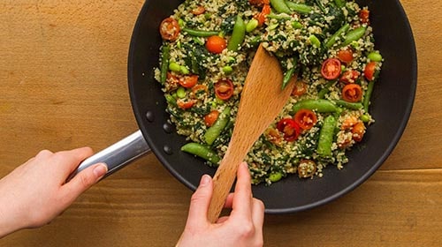 Backofen auf 200 °C Umluft vorheizen. Ofenfeste Form einfetten. 1 EL Olivenöl in einer Pfanne erhitzen. Quinoa Mix tiefgekühlt in die Pfanne geben und während 5 Minuten unter gelegentlichem Rühren anbraten.