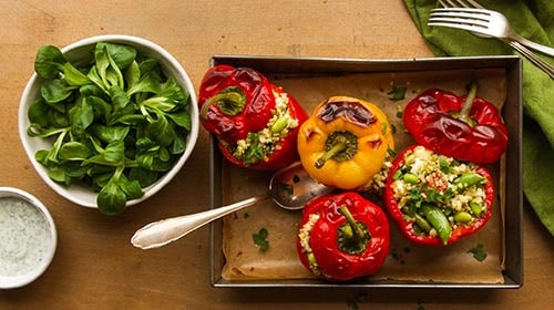 Quinoa-Mischung in die ausgehöhlten Peperoni füllen und anschliessend den Deckel wieder aufsetzen. Die gefüllten Peperoni in die ofenfeste Form setzen und für 15 Minuten bei 200 ºC Umluft im Ofen backen.
