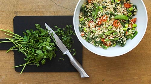 - Den Quinoa Mix vorbereiten und die Petersilie hacken.