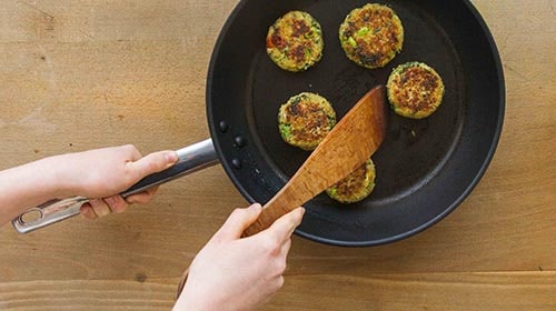 Wenig Öl in einer beschichteten Pfanne erhitzen und die Bratlinge auf jeder Seite ca. 5 Minuten goldbraun anbraten.