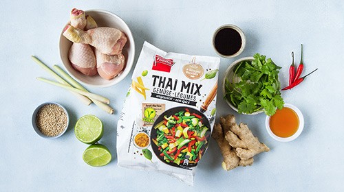 Das Fleisch aus dem Ofen nehmen, den Thai Mix zwischen den Pouletstücken auf dem Blech verteilen und beides zusammen für weitere 10 Minuten im Ofen rösten, bis alles durchgegart ist.
