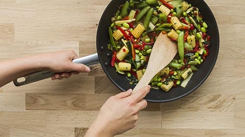 Den Knoblauch, die Frühlingszwiebeln und den Ingwer klein schneiden und andünsten, dann den braunen Zucker hinzufügen und etwas karamellisieren lassen. Mit ca. 2 EL heissem Wasser ablöschen und mit Fischsauce, Srirachasauce (Chilisauce) sowie Sojasauce würzen. Den gefrorenen FINDUS Thai Mix hinzufügen und das Gemüse ein paar Minuten köcheln lassen.
