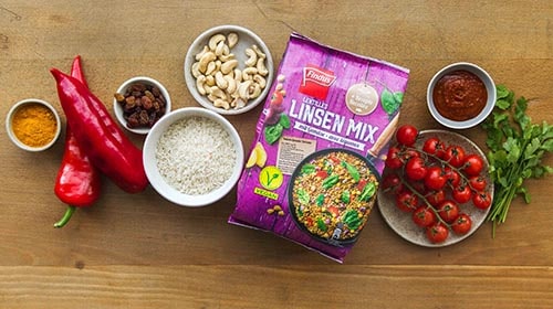 Der Klassiker aus der indischen Küche ist mit dem FINDUS Linsen Mix im Handumdrehen gekocht und eignet sich optimal für die Zubereitung am Vorabend. Linsen, die eiweissreichen Sattmacher, erleben zurzeit ihr grosses Comeback. Kombiniert man Linsen mit Reis, wird die biologische Wertigkeit der Linsen noch erhöht, und alle acht essenziellen Aminosäuren werden geliefert. Eine gesunde Powerkombi, die der ganzen Familie schmeckt!