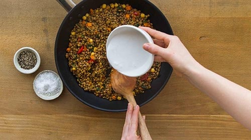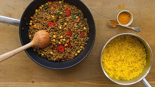 - Reis zubereiten und den Linsen Mix mit Curry anrösten.
