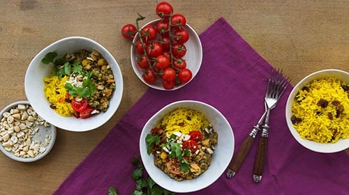 Den Jasminreis mit einer Gabel auflockern und die Sultaninen unterheben. Das Linsen-Dal zusammen mit dem Reis, den zerstossenen Cashewkernen, dem Koriander, den Paprikaringen und den Cherrytomaten servieren. Guten Appetit!