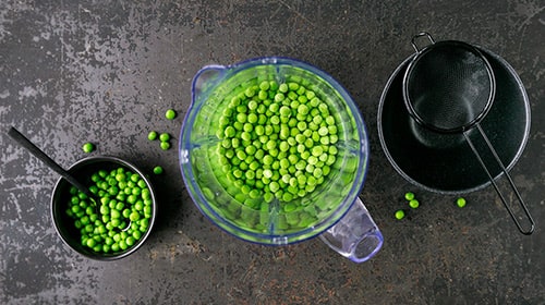 2 EL Erbsen zur Seite stellen. Die restlichen Erbsen mit dem Wasser in einen leistungsstarken Mixer geben. Pürieren und die Flüssigkeit durch ein sehr feines Sieb in eine Schüssel abseihen.