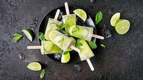 In jede Glaceform 1-2 Gurkenstreifen geben, und die zur Seite gestellten Erbsen auf die Formen verteilen. Mit der Flüssigkeit auffüllen und ca. 1 Stunde gefrieren.