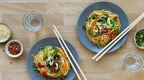 Mélanger les ingrédients liquides pour la sauce et l’ajouter aux légumes. Saler, poivrer et saupoudrer de flocons de piment. Laisser mijoter 2 à 3 minutes, puis ajouter les nouilles cuites. Mélanger le tout et laisser cuire jusqu’à ce que les nouilles soient réchauffées.