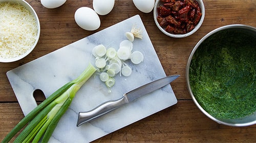 Réchauffer lentement les épinards durant 5 à 7 minutes en remuant de temps en temps. Préchauffer le four à 200 °C. Couper l’oignon en fines rondelles, y compris la partie verte. Égoutter les tomates séchées et les hacher grossièrement. Incorporer le fromage râpé et les œufs battus aux épinards. Mélanger et poivrer.
