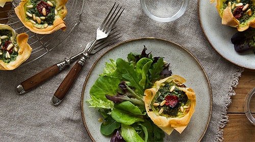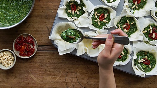 Véritables multitalents, ces strudels-muffins se dégustent aussi bien chauds que froids : en salade composée pour le repas en famille, en apéritif chez des amis ou en snack pour la pause au bureau. Les tomates séchées mélangées au gruyère donnent aux muffins une savoureuse note épicée, tandis que les épinards à la crème apportent toute la douceur nécessaire. Conseil : incorporer aux épinards un verre de jus d’orange : grâce à la vitamine C, le corps assimile mieux les nutriments présents dans les épinards.